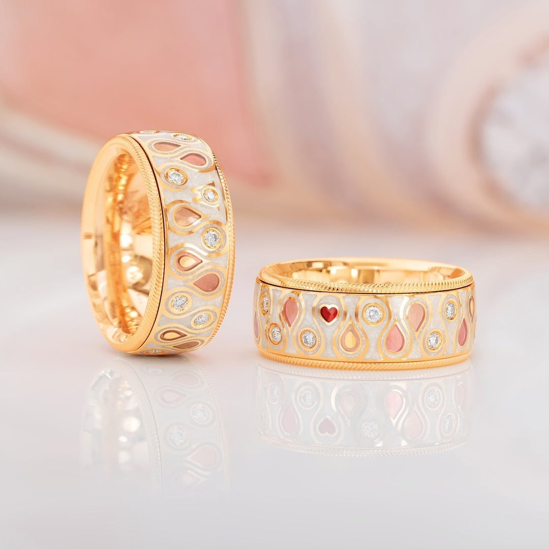 - Die Wellendorff Kaltemaille: In einem aufwendigen Prozess werden transparente und opake Kaltemaille kombiniert. Das Perlmuttweiß wird von Hand in mehreren Schichten aufgetragen, mit feinem Sternenstaub versehen und in mehreren Schritten mit zarten Nudetönen ergänzt, was dem Ring seinen schimmernden Look verleiht und eine perfekt glatte, glänzende Oberfläche garantiert.