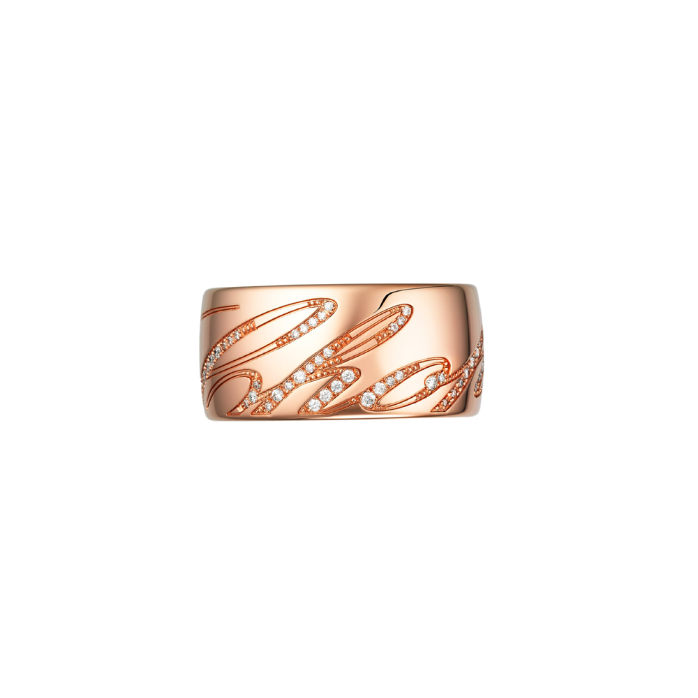 Der geschwungene Schriftzug Chopard ziert gleich mehrfach das Schmuckstück und ist mit Diamanten aufgefasst.