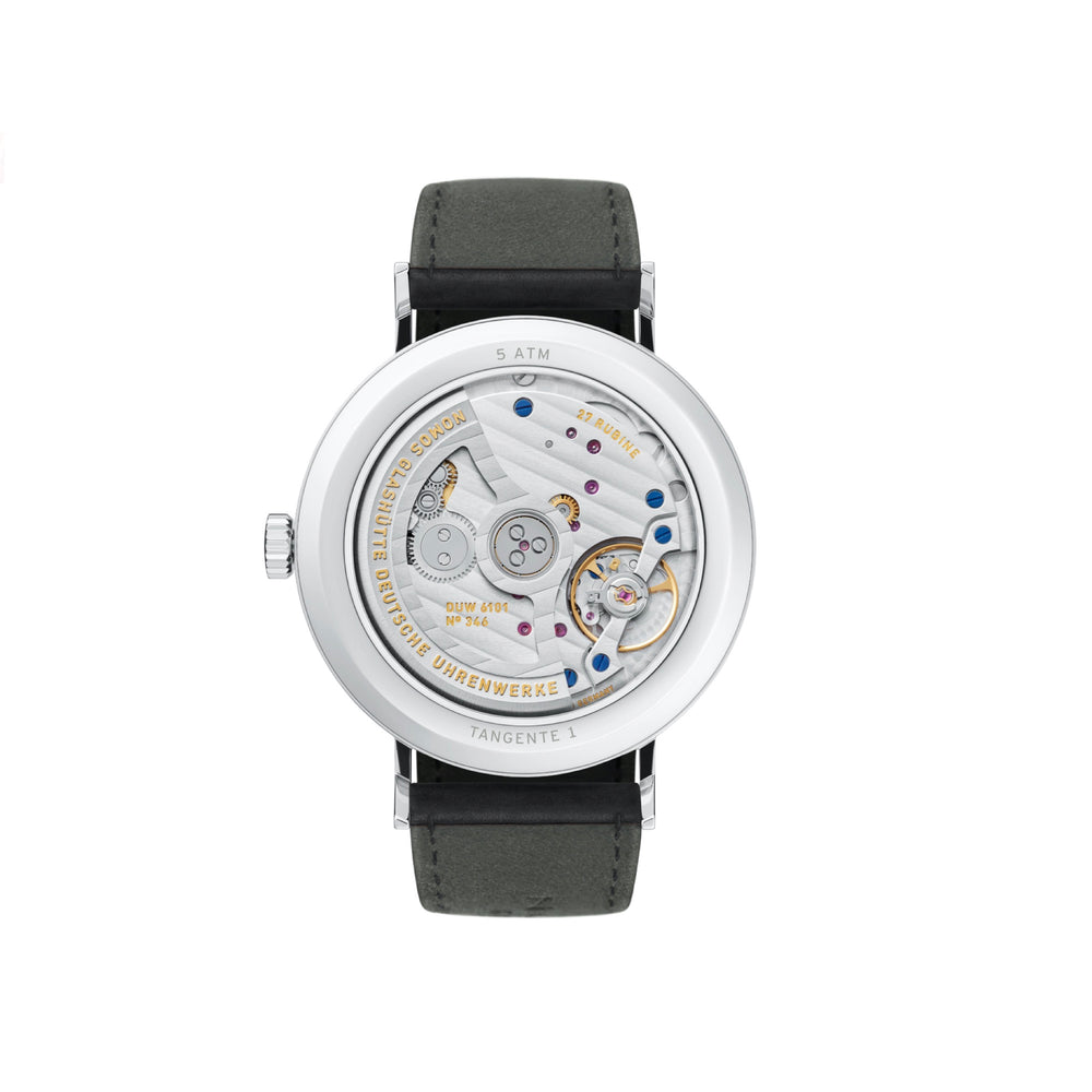 Die NOMOS Glashütte - Tangente mit der Referenz 180 besteht aus einem Stahlgehäuse und Saphierglaslboden. Ihr Durchmesser beträgt 40,5mm mit einer Höhe von 7,8mm. Im Inneren der Armbanduhr ist das Hauseigene Manufakturwerk DUW6101 verbaut. Die Uhr ist spritzwassergeschützt bis 50m.