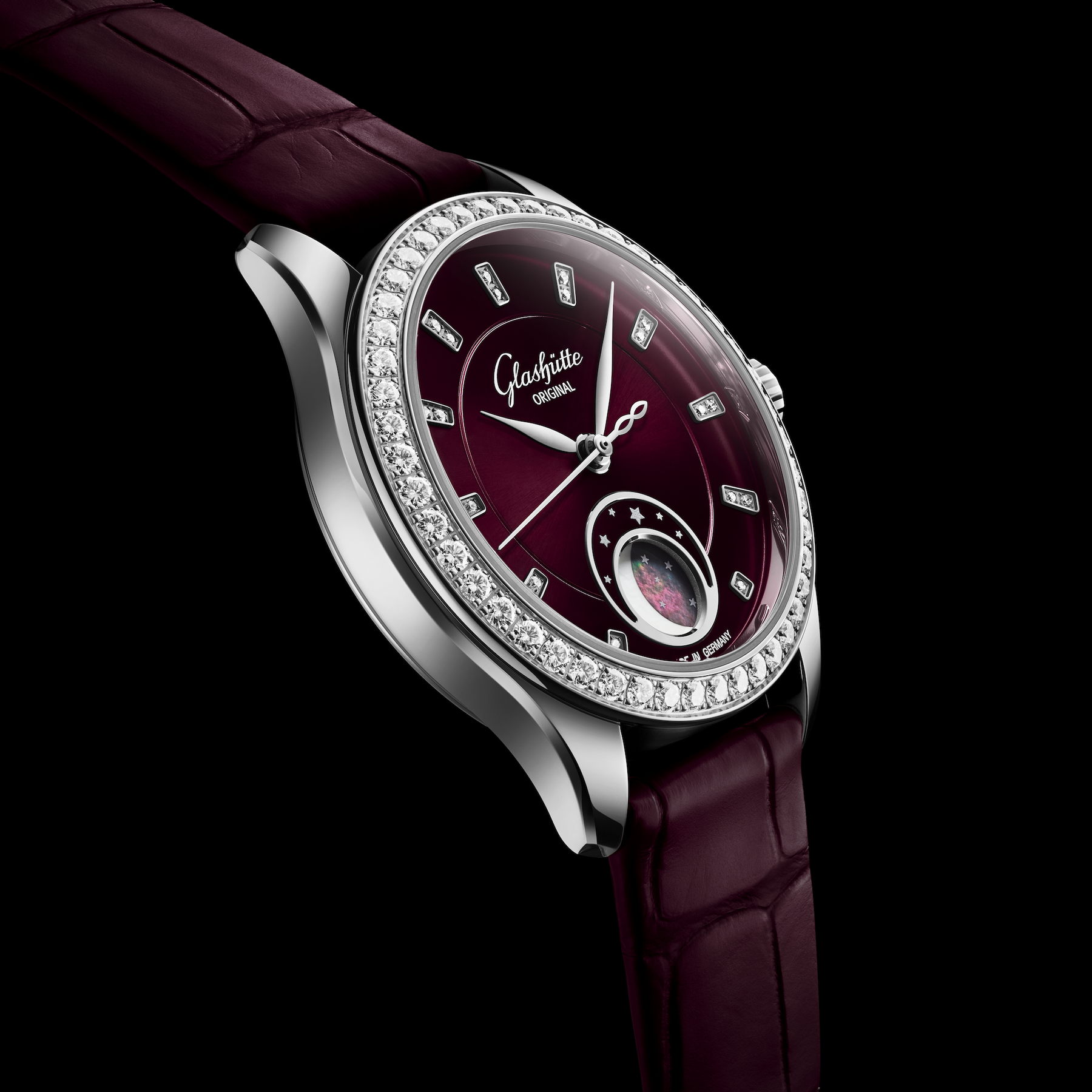 - Zifferblatt: Strahlenschliff, violett transluzent lackiert "Purpursamt", Stunden-Appliken aus Weißgold mit 20 Brillanten, Mondphase aus weißem Perlmutt und Tahiti-Perlmutt, Zeiger in Weißgold