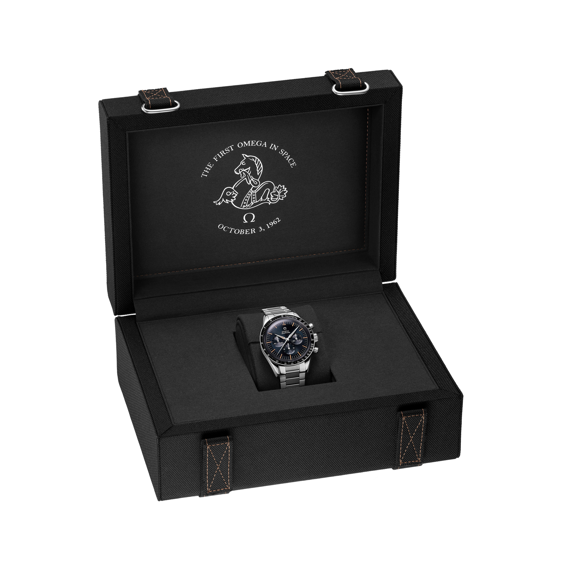 - Gehäuseboden: Edelstahl, Seepferdchen-Medaillon und den Gravuren „THE FIRST OMEGA IN SPACE“ und „OCTOBER 3, 1962“