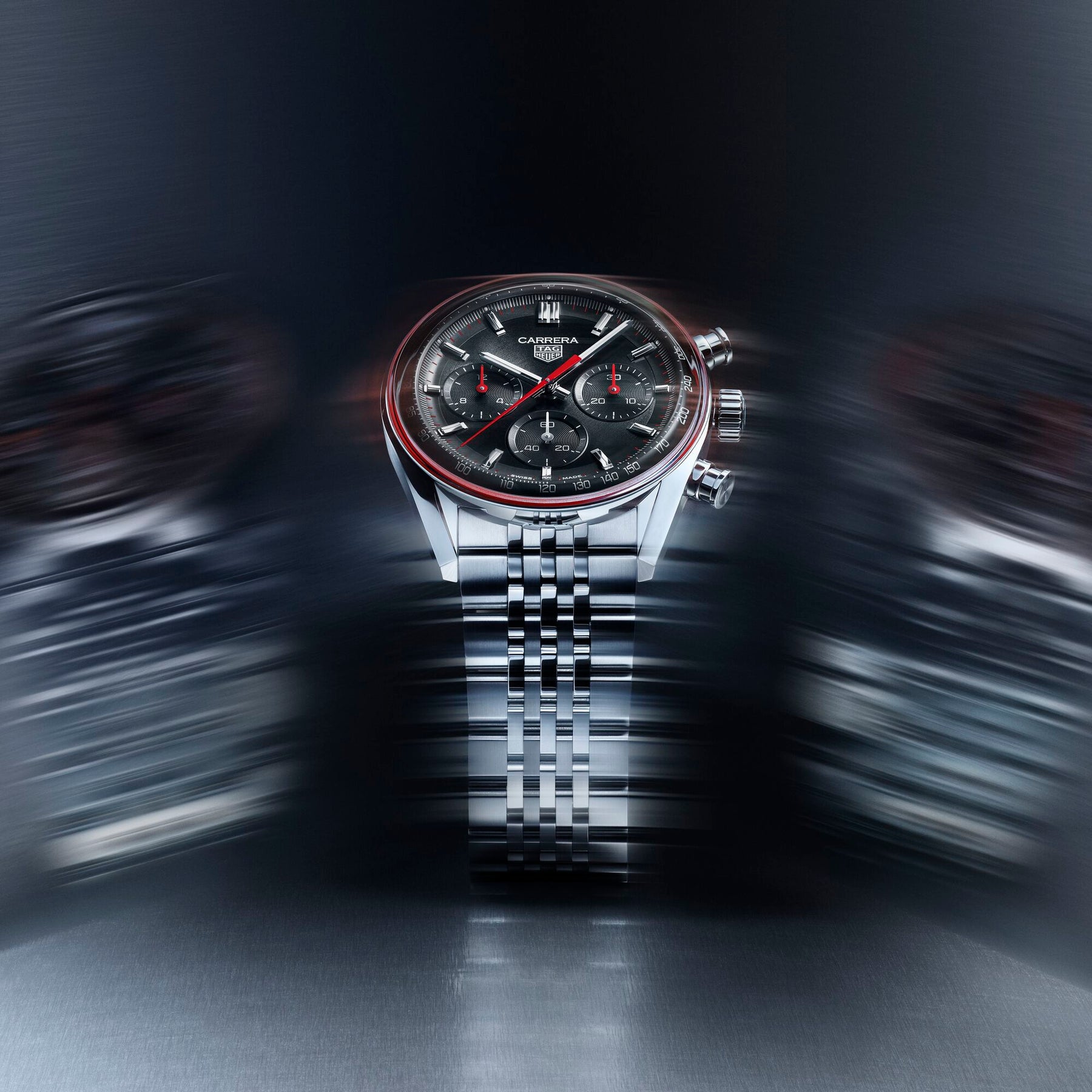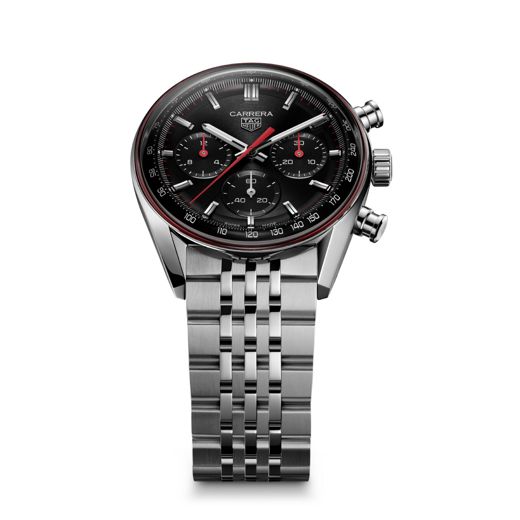 - Zifferblatt: schwarz, Index appliziert, Tachymeterskala, rote Chronographenzeiger und Sekundenzeiger