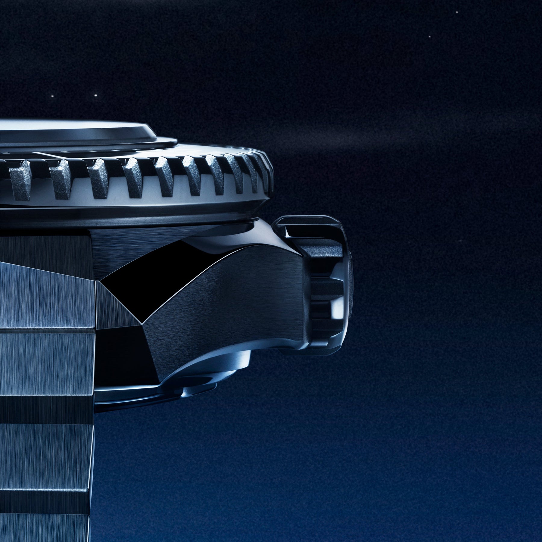 - Lünette: schwarz, Keramik, poliert, Taucherskala mit weißer Emaile, Innenring aus Titan Grad 5, einseitig drehbar