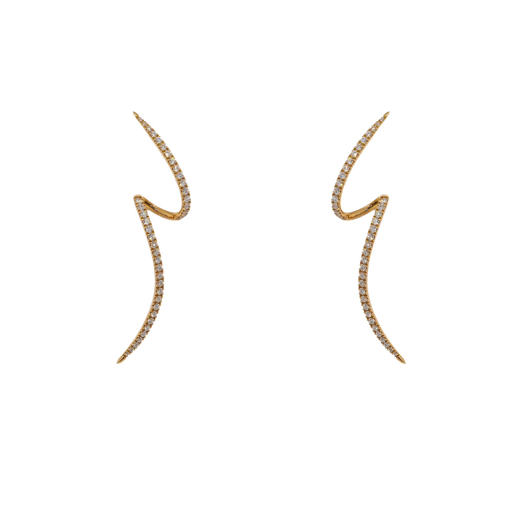 Diese außergewöhnlichen Ohrhänger überzeugen durch ihr elegantes, modern geschwungenes Design. Ihre feinen Linien schmiegen sich harmonisch an die Ohrform an und bilden eine feminine, fließende Silhouette. Weiße Diamanten setzen funkelnde Akzente und verleihen dem Schmuckstück eine luxuriöse Ausstrahlung. Für einen perfekten Sitz sind die Hänger sowohl für das rechte als auch für das linke Ohr individuell gearbeitet.